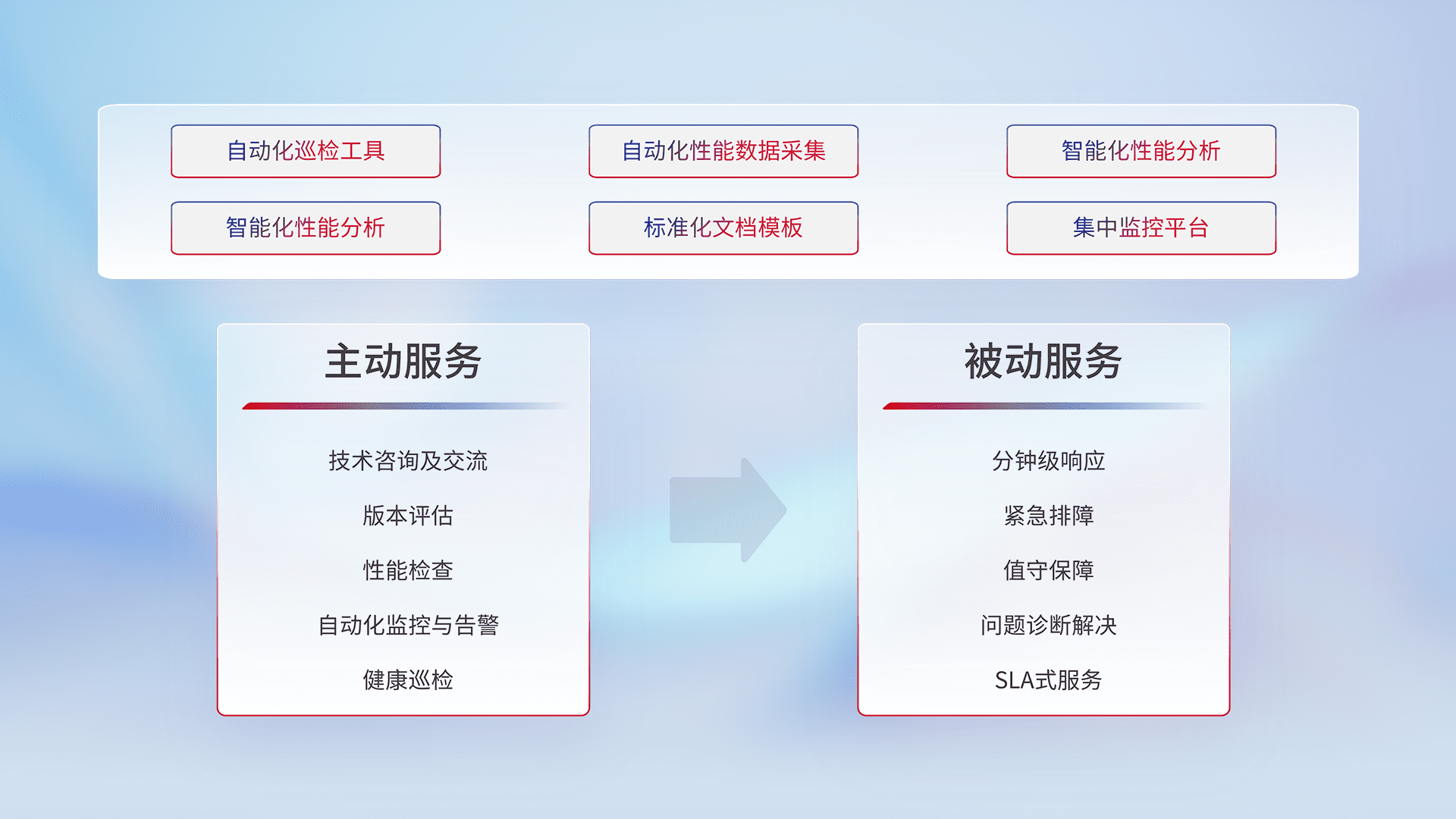 智能化工具和标准化文档,,保障服务质量,,,提供主动服务(包含技术咨询、、、、版本评估、、性能检查、、、、自动化监控与告警、、健康巡检)和被动服务包含(分钟级响应、、、、紧急排障、、值守保障、、、问题诊断解决、、、、SLA服务)。。。
